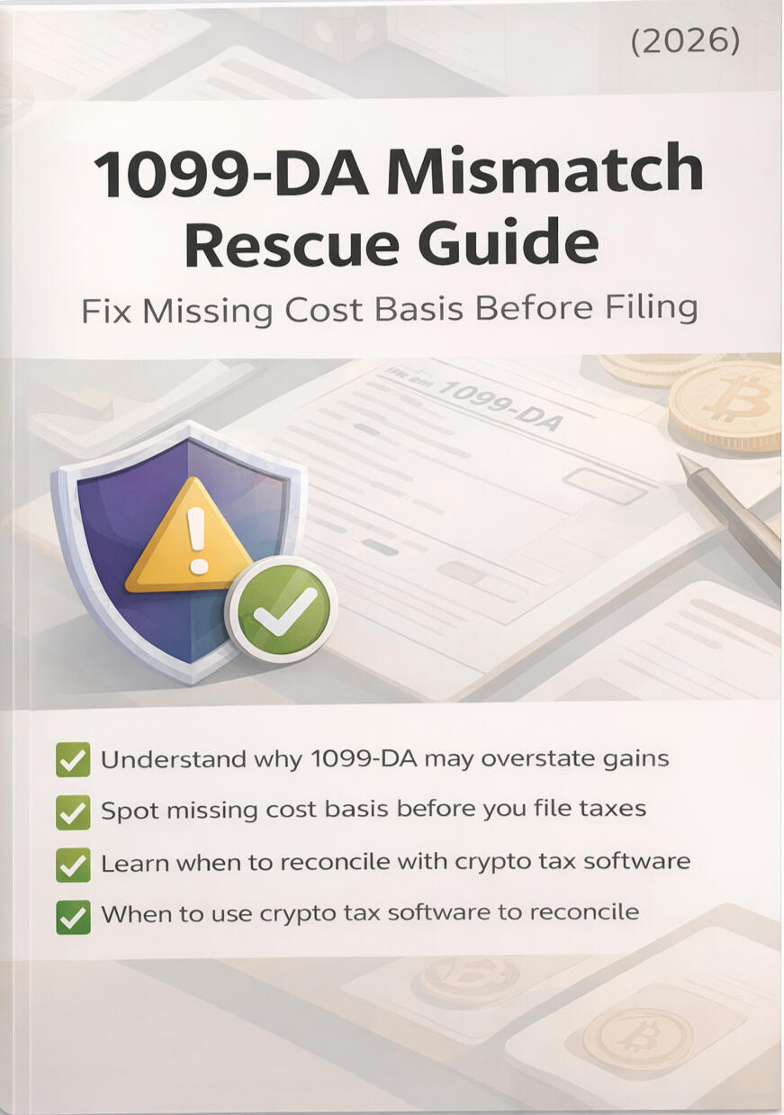 Get the 1099-DA Mismatch Rescue Guide if you want a practical pre-filing walkthrough for missing cost basis, wallet transfers, and exchange mismatch issues.Option 3 — Reconcile with software